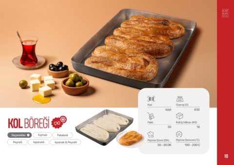 Kod Gramaj (G) 1091 630 KOL BÖREĞİ ÇİĞ Palet 50 Koli İçi Miktarı (KG) 18 Seçenekler Kıymalı Patatesli Pişirme Süresi (DK) Pişirme Derecesi (°C) Peynirli Ispanaklı Ispanak & Peynirli 30 - 35 DK 195 - 200 C 10