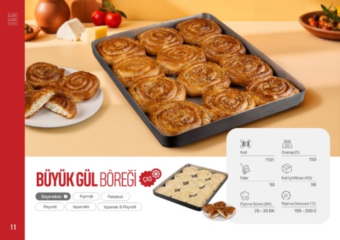 Kod Gramaj (G) 1101 150 Çiğ BÜYÜK GÜL BÖREĞİ ÇİĞ Palet 50 Koli İçi Miktarı (KG) 96 Seçenekler Kıymalı Patatesli Pişirme Süresi (DK) Pişirme Derecesi (°C) Peynirli Ispanaklı Ispanak & Peynirli 25 - 30 DK 195 - 200 C 11