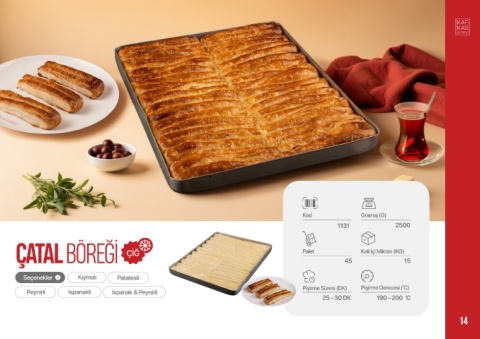 Kod Gramaj (G) 1131 2500 ÇATAL BÖREĞİ ÇİĞ Palet 45 Koli İçi Miktarı (KG) 15 Seçenekler Kıymalı Patatesli Pişirme Süresi (DK) Pişirme Derecesi (°C) Peynirli Ispanaklı Ispanak & Peynirli 25 - 30 DK 190 - 200 °C 14
