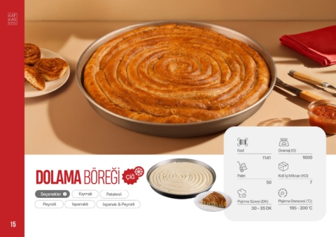 Kod Gramaj (G) 1141 1600 Çiğ DOLAMA BÖREĞİ ÇİĞ Palet 50 Koli İçi Miktarı (KG) 7 Seçenekler Kıymalı Patatesli Pişirme Süresi (DK) Pişirme Derecesi (°C) Peynirli Ispanaklı Ispanak & Peynirli 30 - 35 DK 195 - 200 °C 15