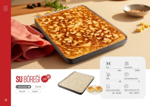 Kod Gramaj (G) 1161 3500 Çiğ SU BÖREĞİ ÇİĞ Palet 40 Koli İçi Miktarı (KG) 5 Seçenekler Kıymalı Pişirme Süresi (DK) Pişirme Derecesi (°C) Peynirli Kaşarlı 30 - 35 DK 195 - 200 °C 17