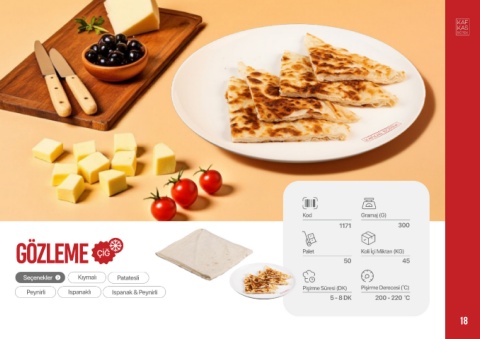 Kod Gramaj (G) 1171 300 GÖZLEME ÇİĞ Palet 50 Koli İçi Miktarı (KG) 45 Seçenekler Kıymalı Patatesli Pişirme Süresi (DK) Pişirme Derecesi (°C) Peynirli Ispanaklı Ispanak & Peynirli 5 - 8 DK 200 - 220 °C 18