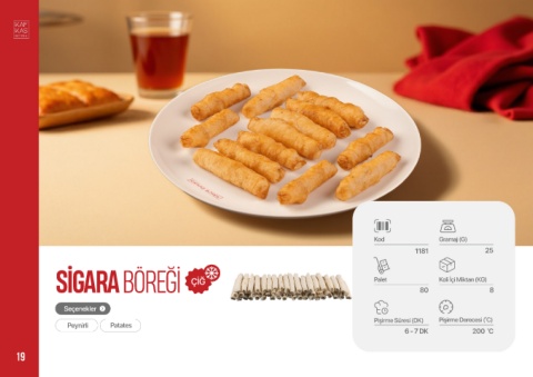 Kod Gramaj (G) 1181 25 Çiğ SİGARA BÖREĞİ ÇİĞ Palet 80 Koli İçi Miktarı (KG) 8 Seçenekler Pişirme Süresi (DK) Pişirme Derecesi (°C) Peynirli Patates 6 - 7 DK 200 °C 19