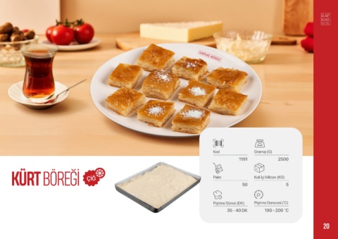 Kod Gramaj (G) 1191 2500 KÜRT BÖREĞİ ÇİĞ Palet 50 Koli İçi Miktarı (KG) 5 Pişirme Süresi (DK) Pişirme Derecesi (°C) 35 - 40 DK 190 - 200 °C 20