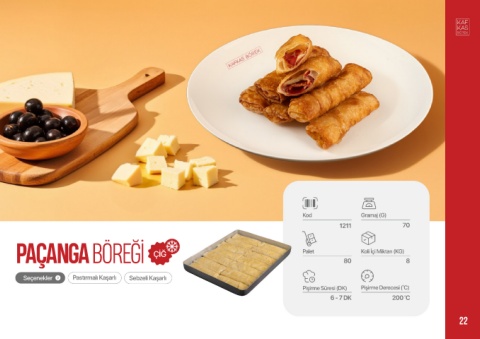 Kod Gramaj (G) 1211 70 PAÇANGA BÖREĞİ ÇİĞ Palet 80 Koli İçi Miktarı (KG) 8 Seçenekler Pastırmalı Kaşarlı Sebzeli Kaşarlı Pişirme Süresi (DK) Pişirme Derecesi (°C) 6 - 7 DK 200 °C 22