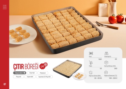 Kod Gramaj (G) 1061 40 Çiğ ÇITIR BÖREĞİ ÇİĞ Palet 50 Koli İçi Miktarı (KG) 360 Seçenekler Kıymalı Patatesli Pişirme Süresi (DK) Pişirme Derecesi (°C) Peynirli Ispanaklı Ispanak & Peynirli 30 - 35 DK 195 - 200 C 07