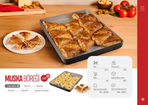 Kod Gramaj (G) 1071 120 MUSKA BÖREĞİ ÇİĞ Palet 45 Koli İçi Miktarı (KG) 130 Seçenekler Kıymalı Patatesli Pişirme Süresi (DK) Pişirme Derecesi (°C) Peynirli Ispanaklı Ispanak & Peynirli 30 - 35 DK 195 - 200 C 08